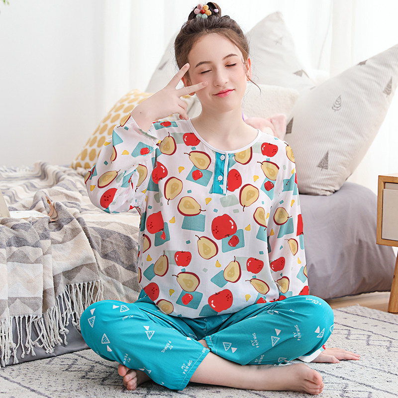 女童棉绸睡衣夏季青少年大童儿童薄款绵绸女孩长袖空调家居服套装