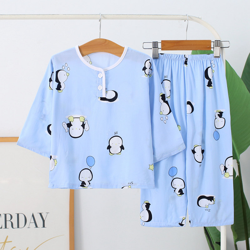 夏季男童女孩棉绸睡衣套装儿童女童宝宝七分袖绵绸家居服空调服