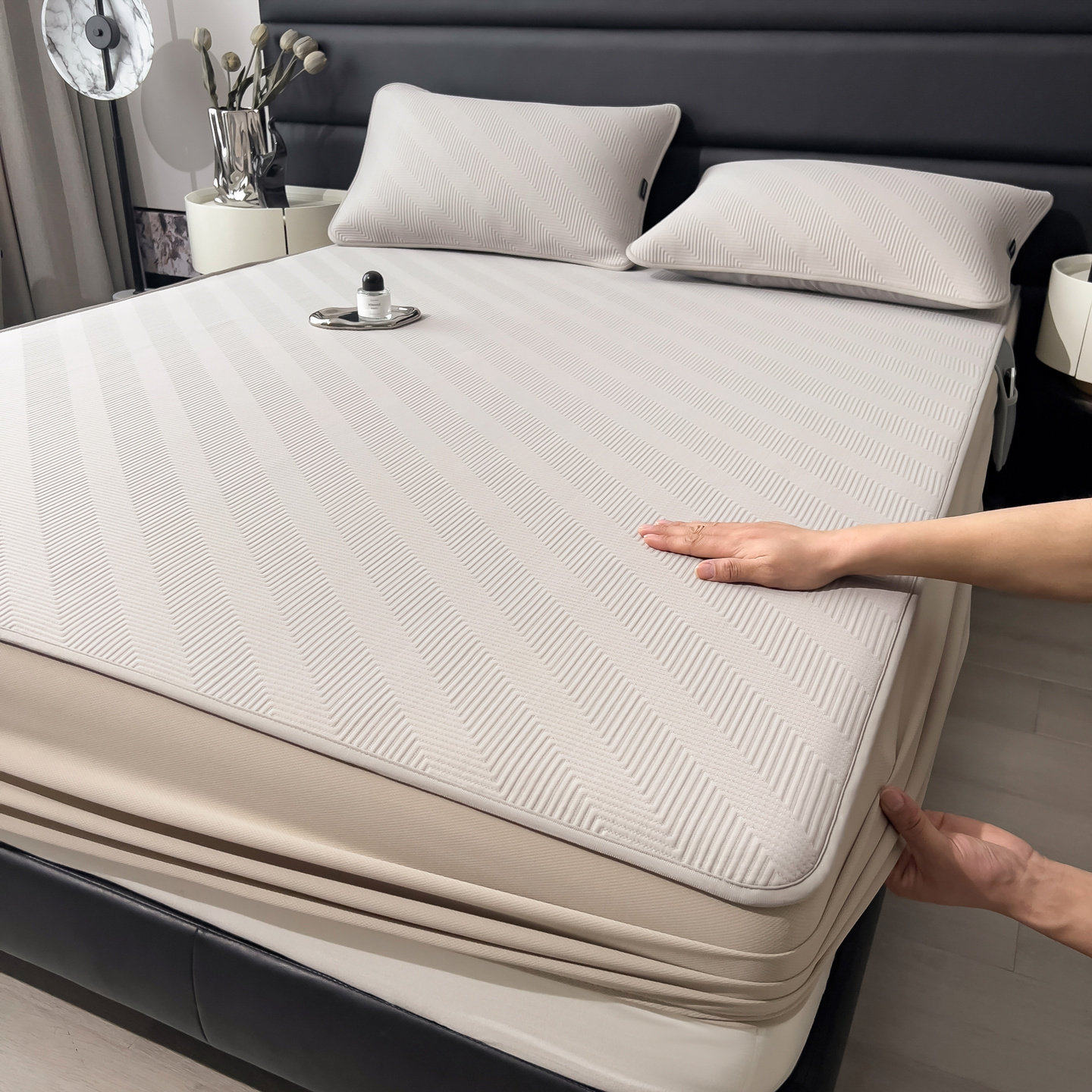 轻奢高级感条纹冰丝凉席床笠夏天冰豆豆空调软席子防滑床单可机洗