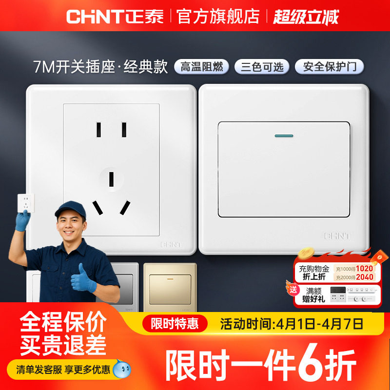 正泰旗舰店家用86型10a暗装墙壁空调16a一开五孔插座面板开关白7m