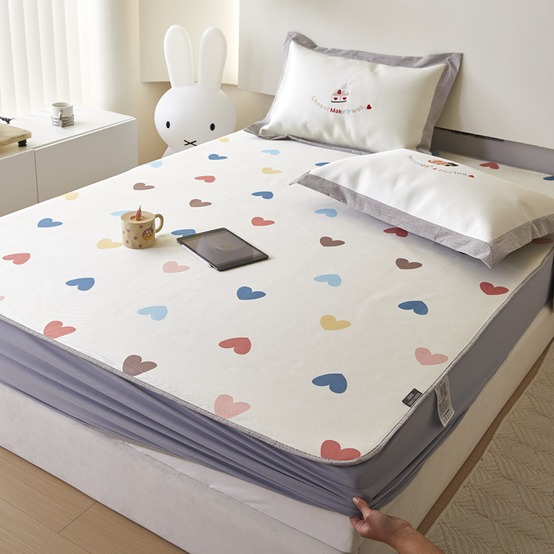 少女心夏季冰丝凉席三件套可水洗爱心印花刺绣床笠款空调软席1.8m