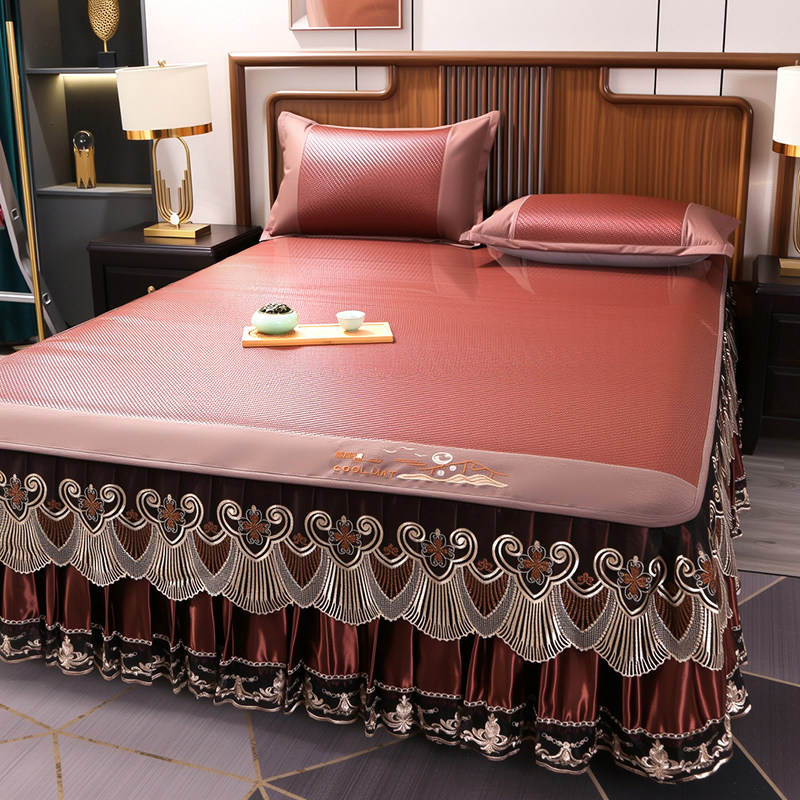 刺绣藤席三件套夏季凉席冰丝席床单床裙款欧式空调软席防滑可拆卸
