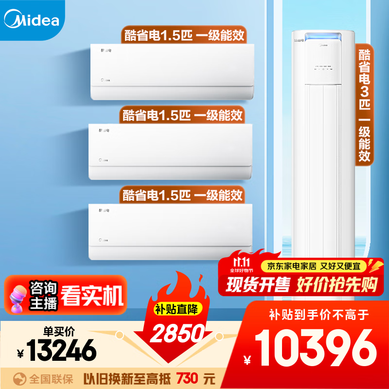 美的空调套装 一套购齐 酷省电新一级能效 变频冷暖 家用节能省电 国家补贴 卧室挂机+客厅立式柜机 酷省电大三室一厅