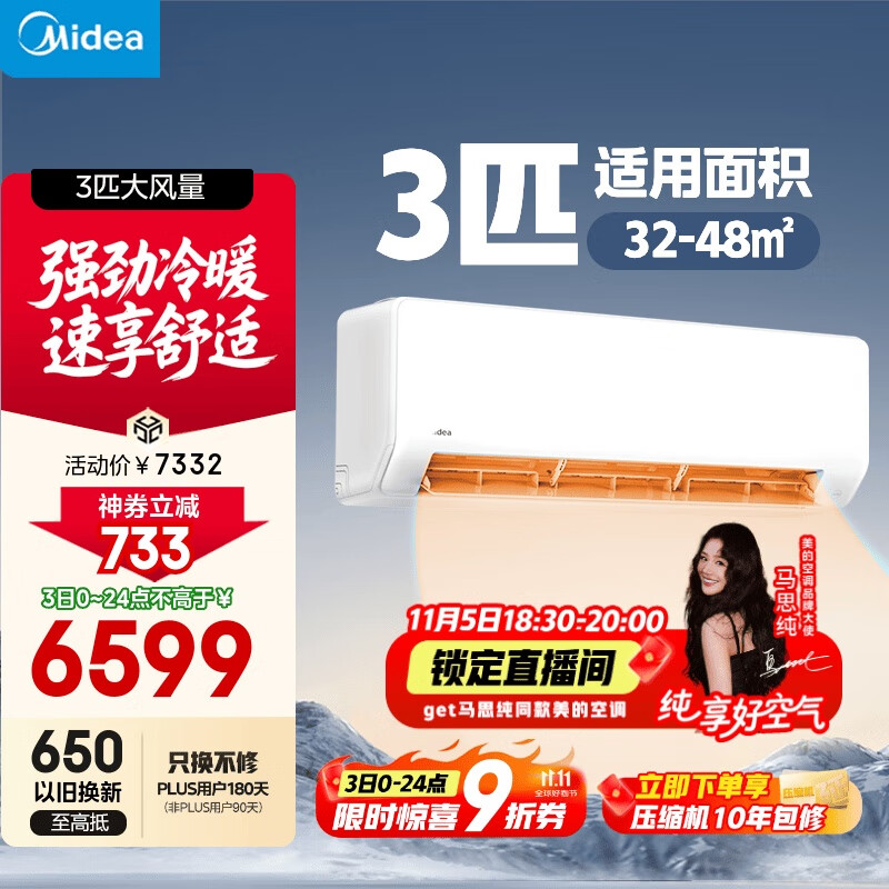 美的空调 大3匹挂机 客厅空调 一级能效 壁挂式变频冷暖空调 舒适风 48㎡全覆盖 KFR-72GW/G1-1A