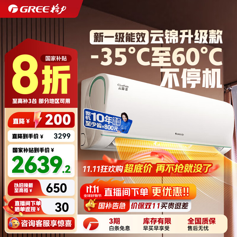 格力(GREE)空调挂机云锦三代/二代新一级能效变频冷暖 自清洁 WIFI壁挂式卧室空调挂机 家电国家补贴20%空调 1.5匹 一级能效 云锦三代新升级款