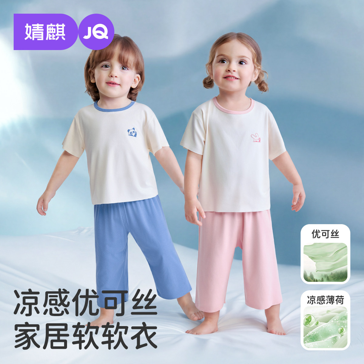 婧麒儿童睡衣优可丝套装薄款夏季短袖无痕男女童宝宝家居空调衣服