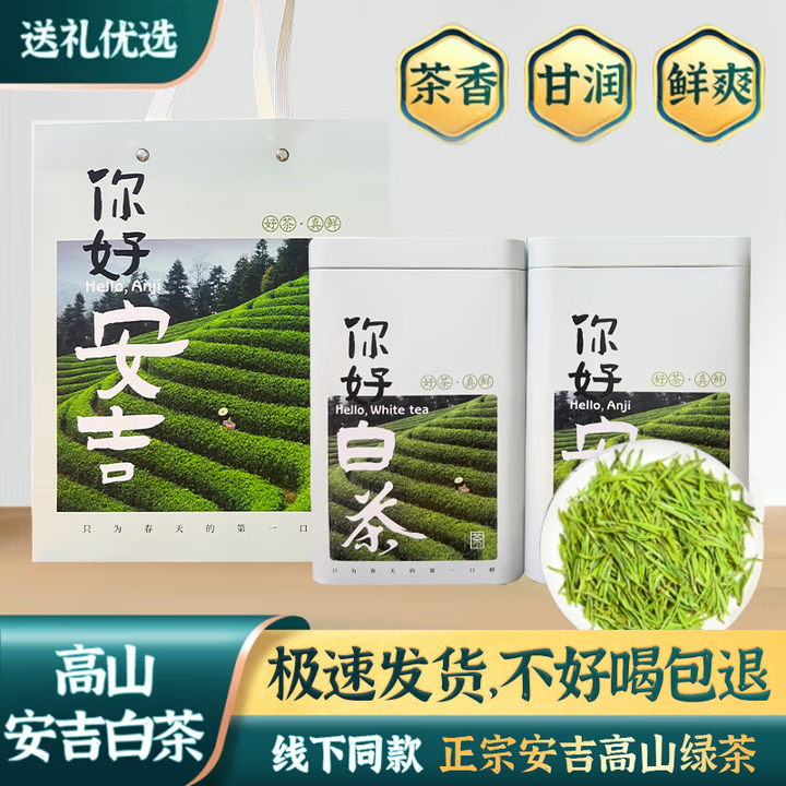 源聞白茶茶叶绿茶 原产地安吉白茶雨前特级春茶2025新茶 节日送礼礼盒装 自喝简装100g*2罐送礼袋
