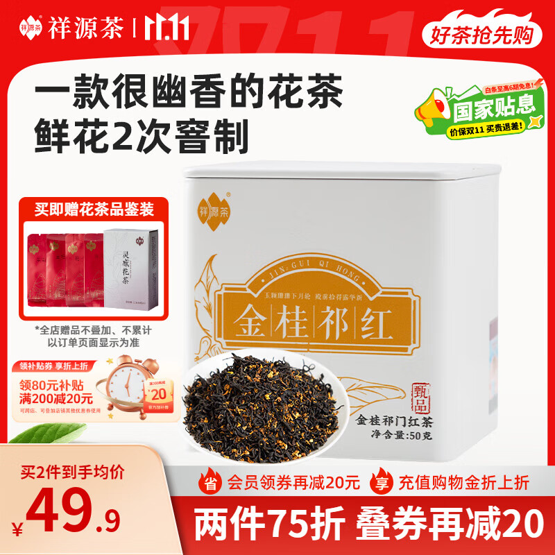 祥源茶 桂花红茶 特二级甄品金桂祁红香螺窨制花茶 祁门红茶叶自己喝 罐装50g