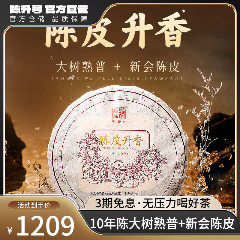 2023陈升号陈皮升香普洱茶357g云南勐海普洱熟茶新会陈皮饼茶茶叶