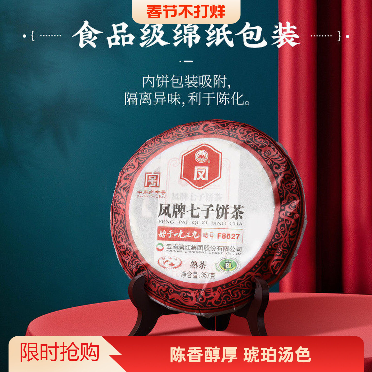 凤牌茶叶 云南凤庆普洱熟茶F8527七子饼熟茶357g茶饼送礼佳品收藏
