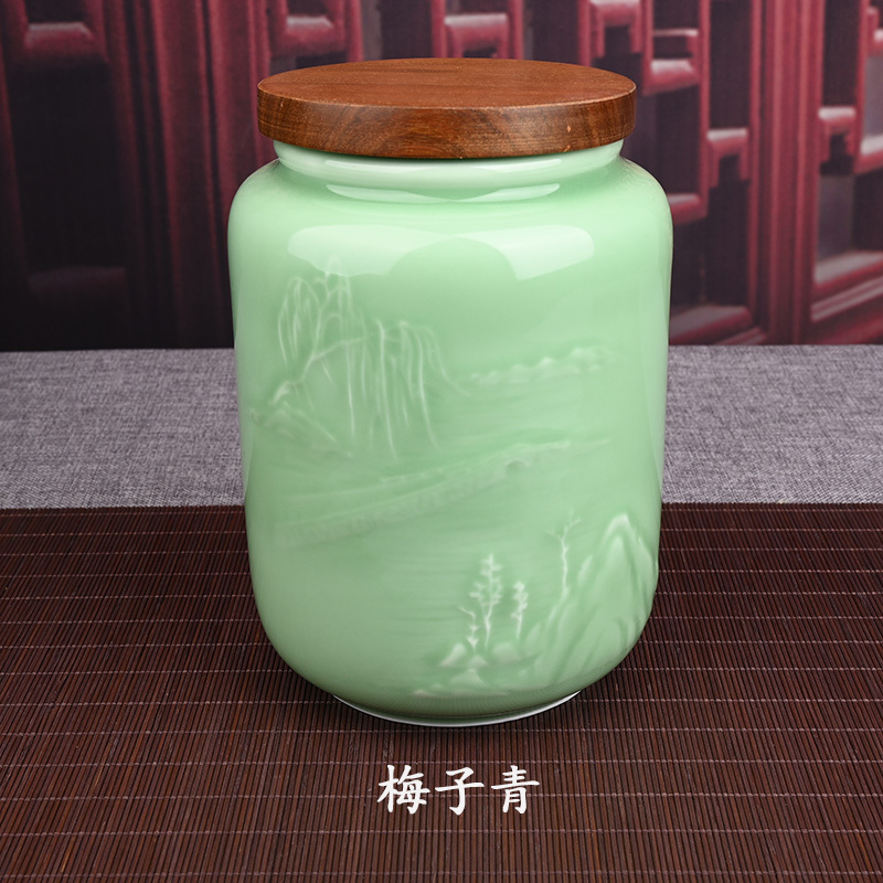 精品青瓷大号存茶罐密封家用中式复古木盖茶叶罐子大容量茶仓茶盒