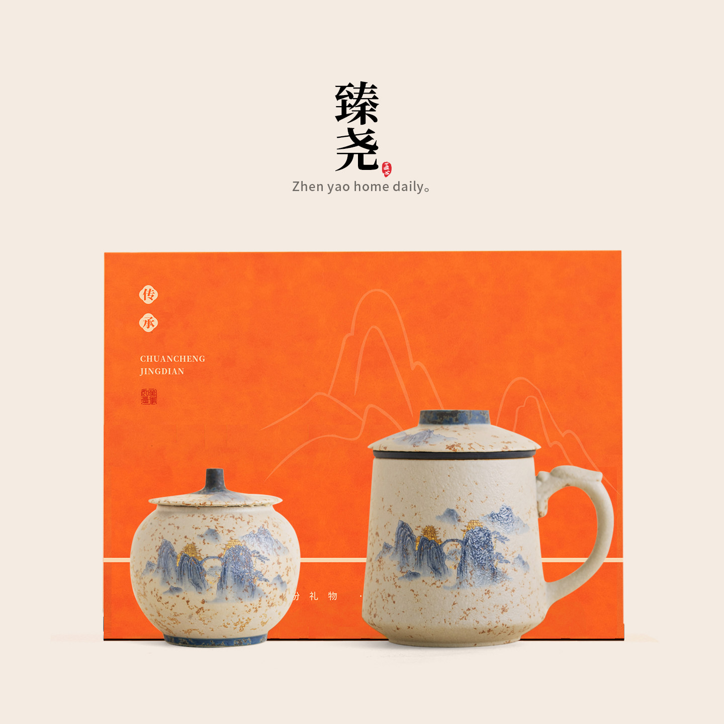 臻尧青花火石红过滤办公杯茶叶罐礼盒伴手礼公司送礼送长辈朋友