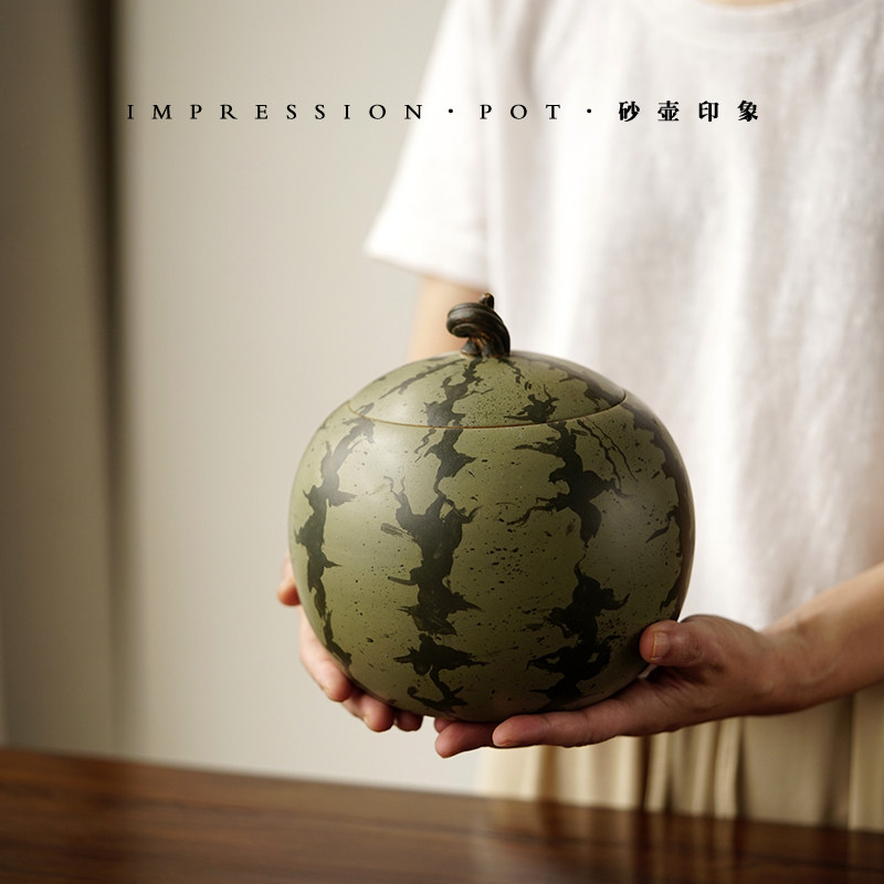 宜兴紫砂茶叶罐 西瓜罐 原矿段泥粉绿浆 450克 砂壶印象