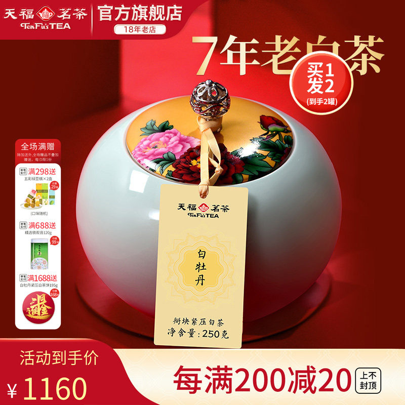 天福茗茶陈年白牡丹福鼎白茶掰块紧压茶叶礼盒装250g*2罐