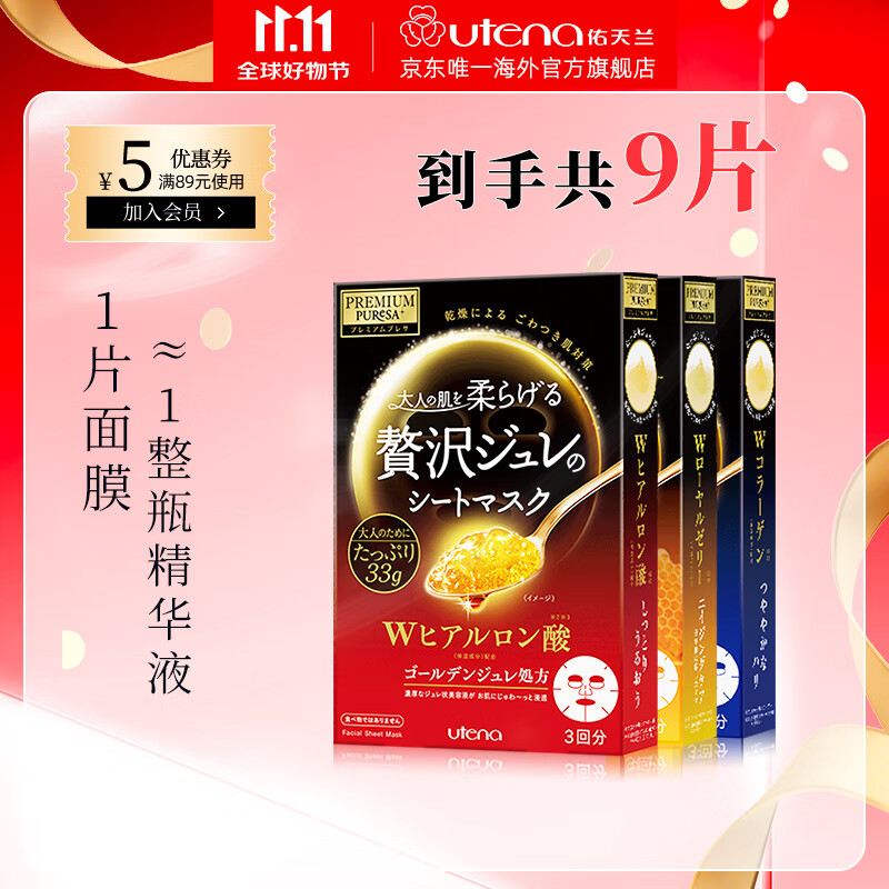 佑天兰日本进口黄金果冻精华面膜3盒玻尿酸/胶原蛋白/蜂王浆/积雪草精华 红黄蓝各1盒