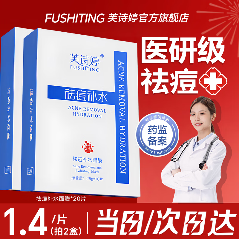 芙诗婷祛痘补水面膜淡化痘印控油收缩毛孔痘痘印坑医研级青少年祛痘面膜 祛痘补水面膜20片 10片/盒