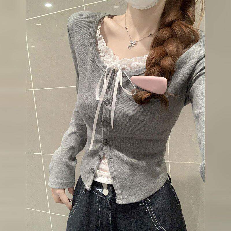 中国风简约复古圆领上衣 春夏新款网纱长袖拼接打底衫 洋气女T恤