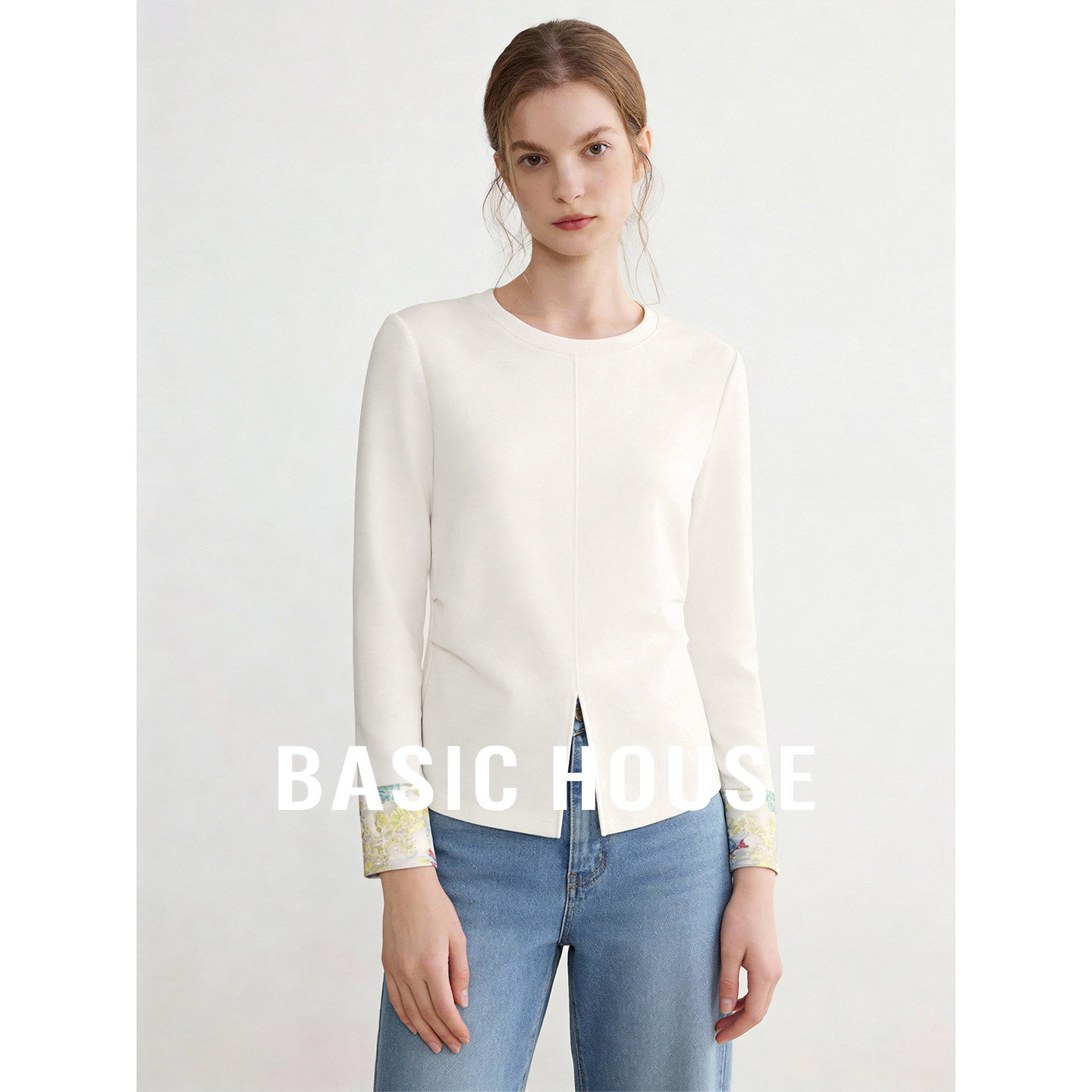 Basic House/百家好新中式圆领刺绣打底上衣女26春季袖口设计T恤