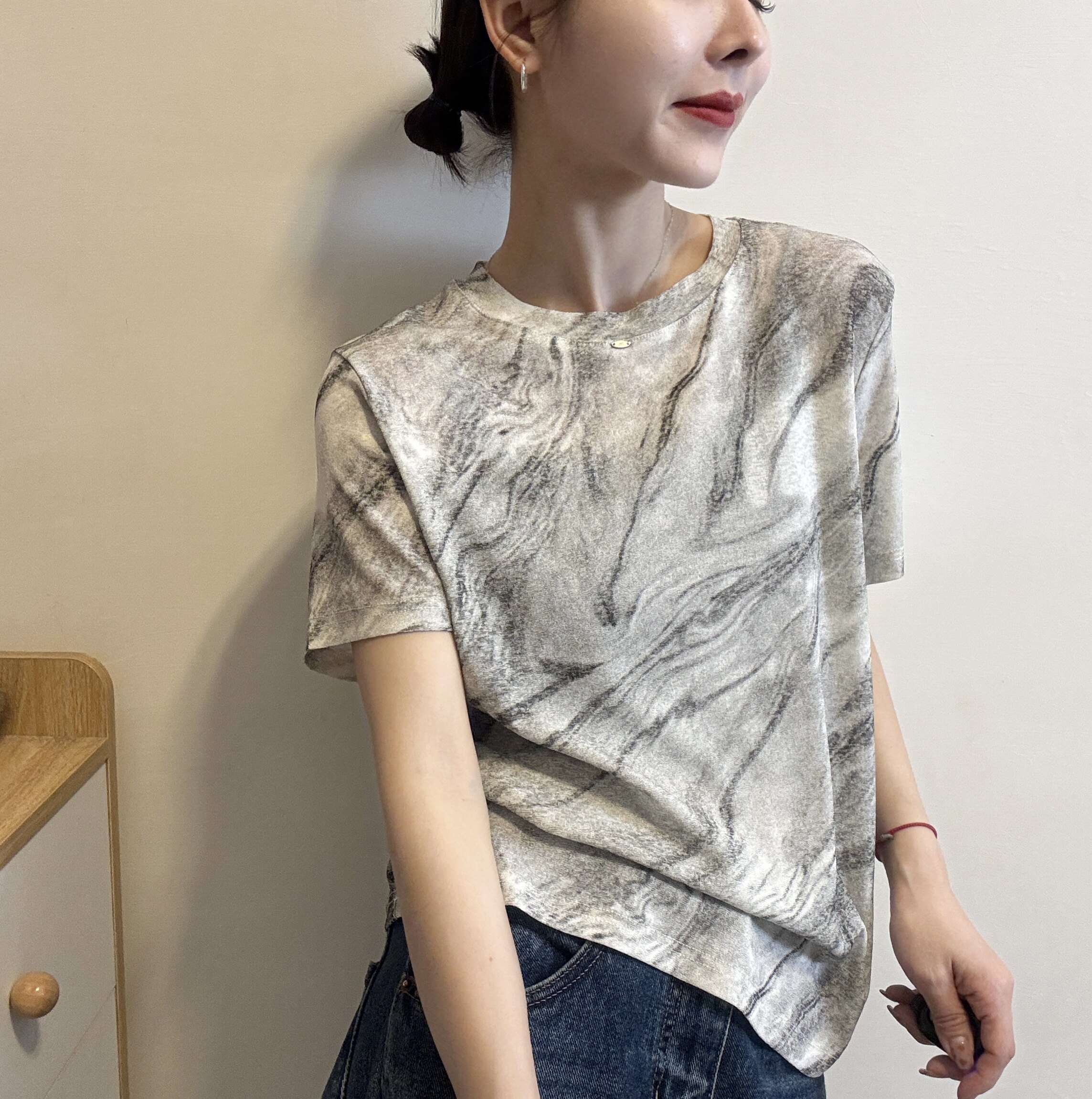 欧洲站2026春季新欧货小众设计感晕染印花圆领大板百搭短袖T恤女