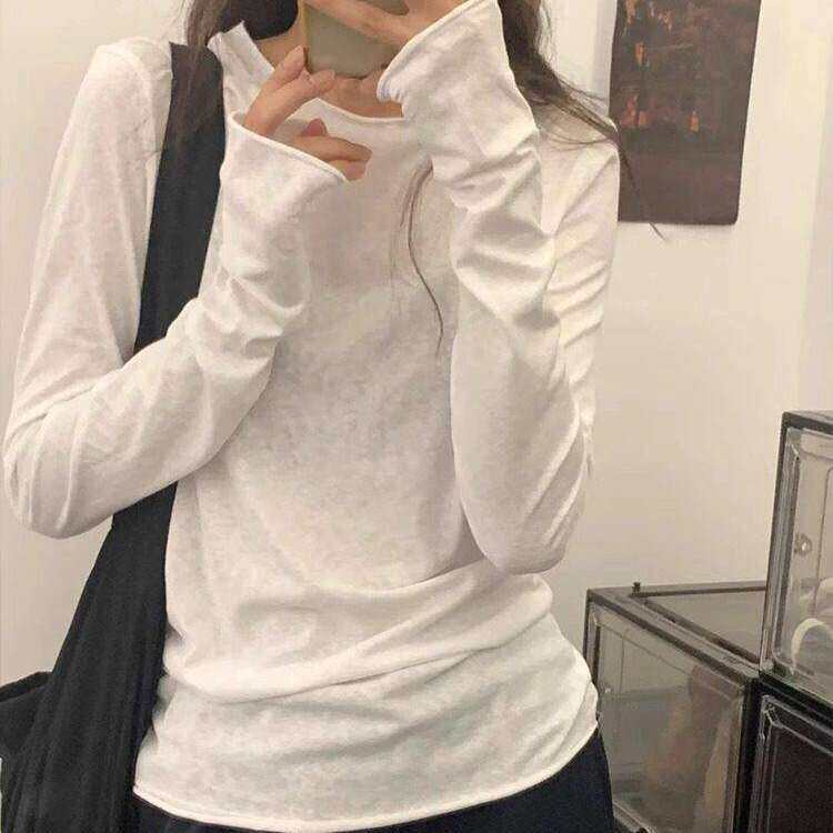 韩系卷边白色正肩长袖t恤女春秋内搭打底衫修身显瘦基础百搭上衣