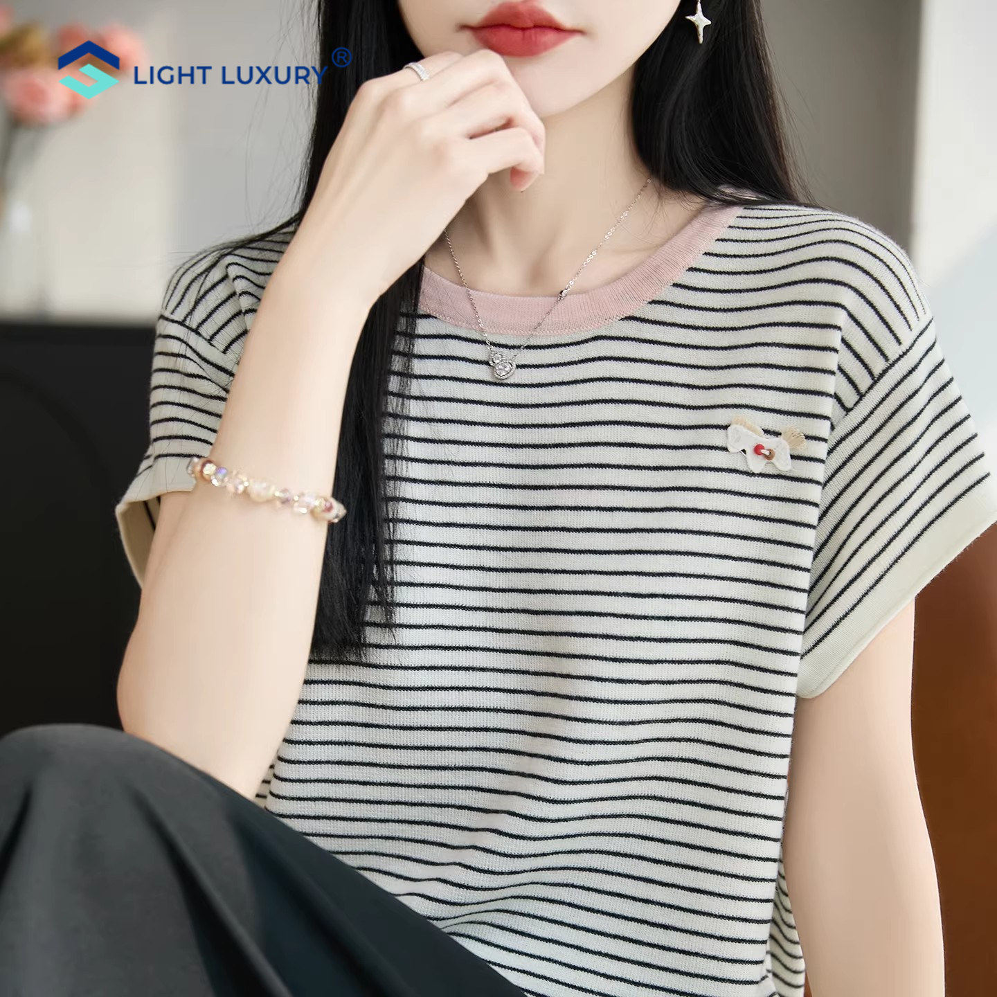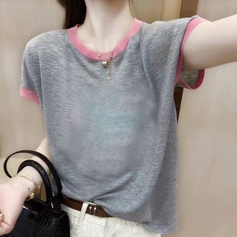 针织短袖T恤女夏季新品圆领条纹温柔内搭打底衫撞色减龄宽松上衣