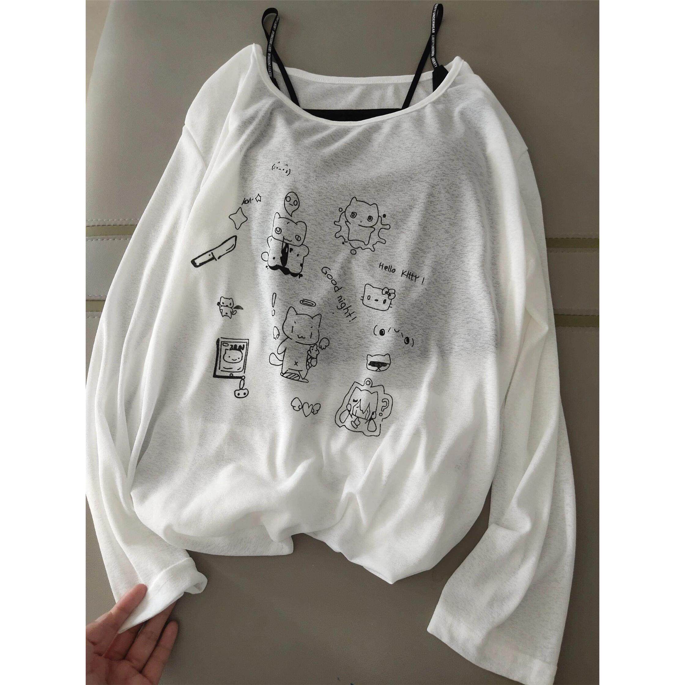 2025新款韩系夏日薄纱款白色斜肩防晒罩衫上衣女宽松露肩长袖t恤