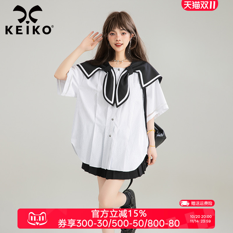 KEIKO 航海系减龄条纹短袖衬衫夏季学院海军领别致宽松上衣水手服