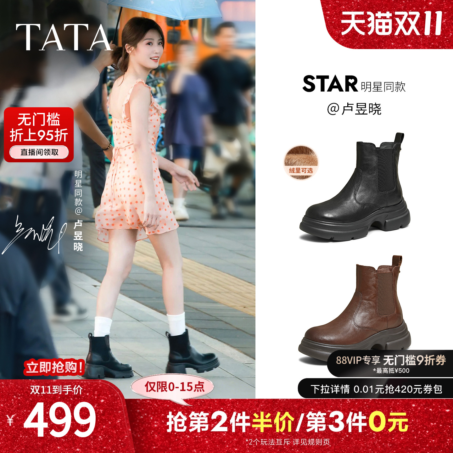 卢昱晓同款TATA他她靴子牛皮烟筒靴加绒厚底切尔西靴短靴7OL44DD5