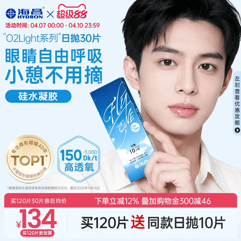 【限时买赠】海昌O2Light硅水凝胶日抛30片隐形近视眼镜透氧进口