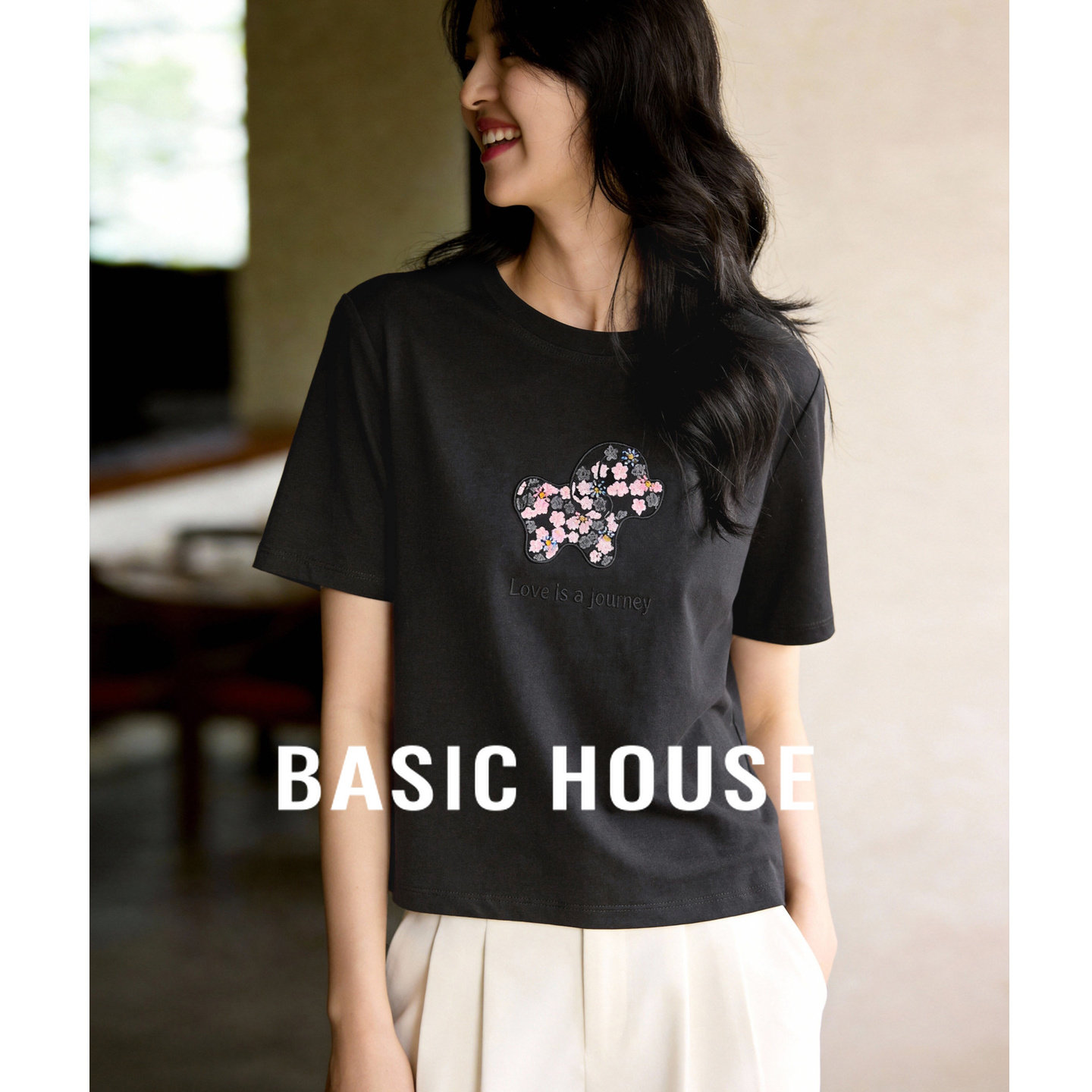 Basic House/百家好花朵刺绣圆领短袖T恤女春季新款宽松显瘦上衣