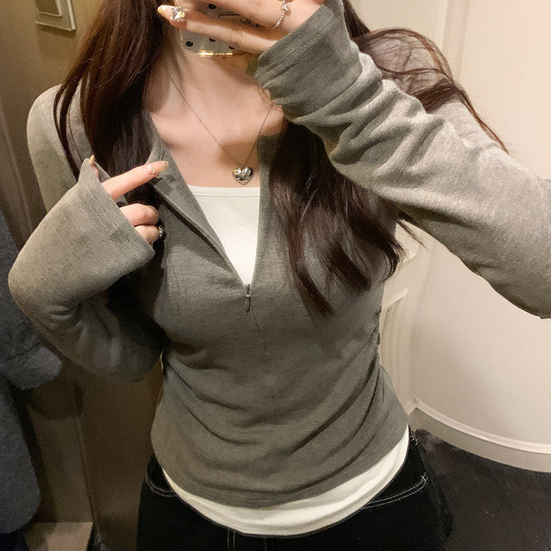 苏三三假两件上衣女秋季2025新款打底衫内搭修身早秋V领长袖t恤