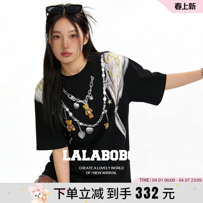 【视错系列】LALABOBO26年春新款短袖原创3D链条印花黑色宽松T恤