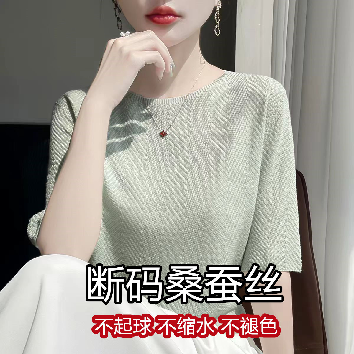 100桑蚕丝五分袖圆领打底衫女气质配西装百搭轻薄针织T恤洋气小衫
