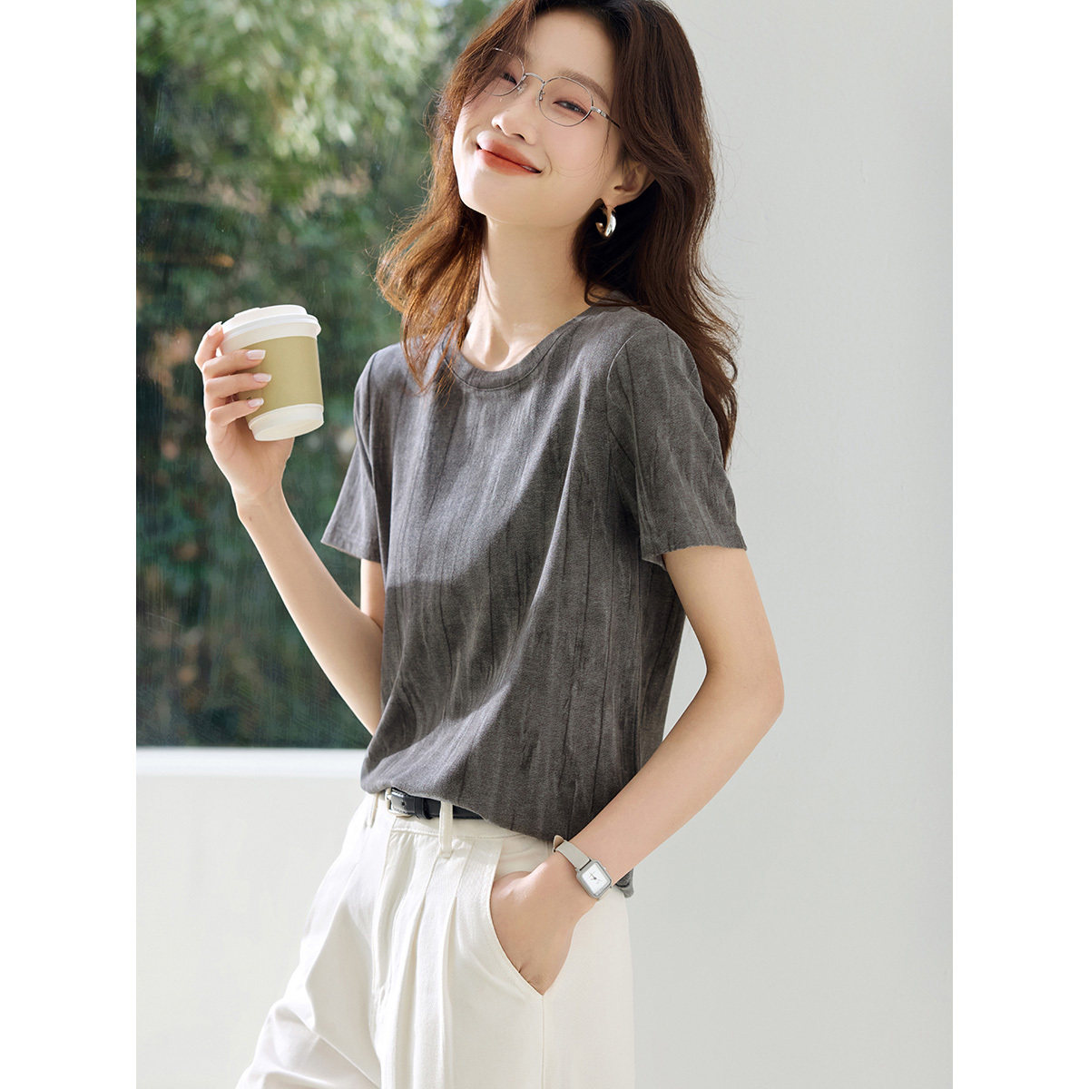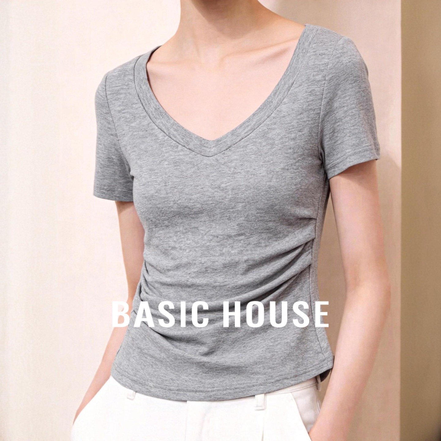 Basic House/百家好灰色V领短袖T恤女夏薄款凉感垂感百搭简约上衣