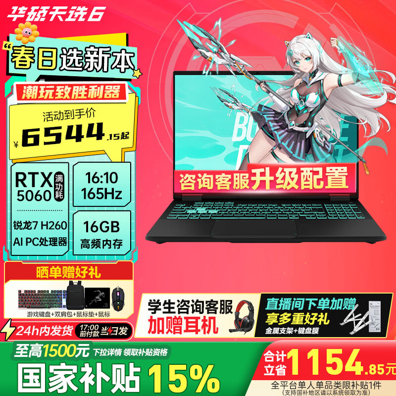 华硕(ASUS)天选6 国家补贴15% 16英寸电竞游戏本 笔记本电脑 锐龙 7 H260/RTX5060///日蚀灰 (16+512) 16G内存/512G高速固态硬盘
