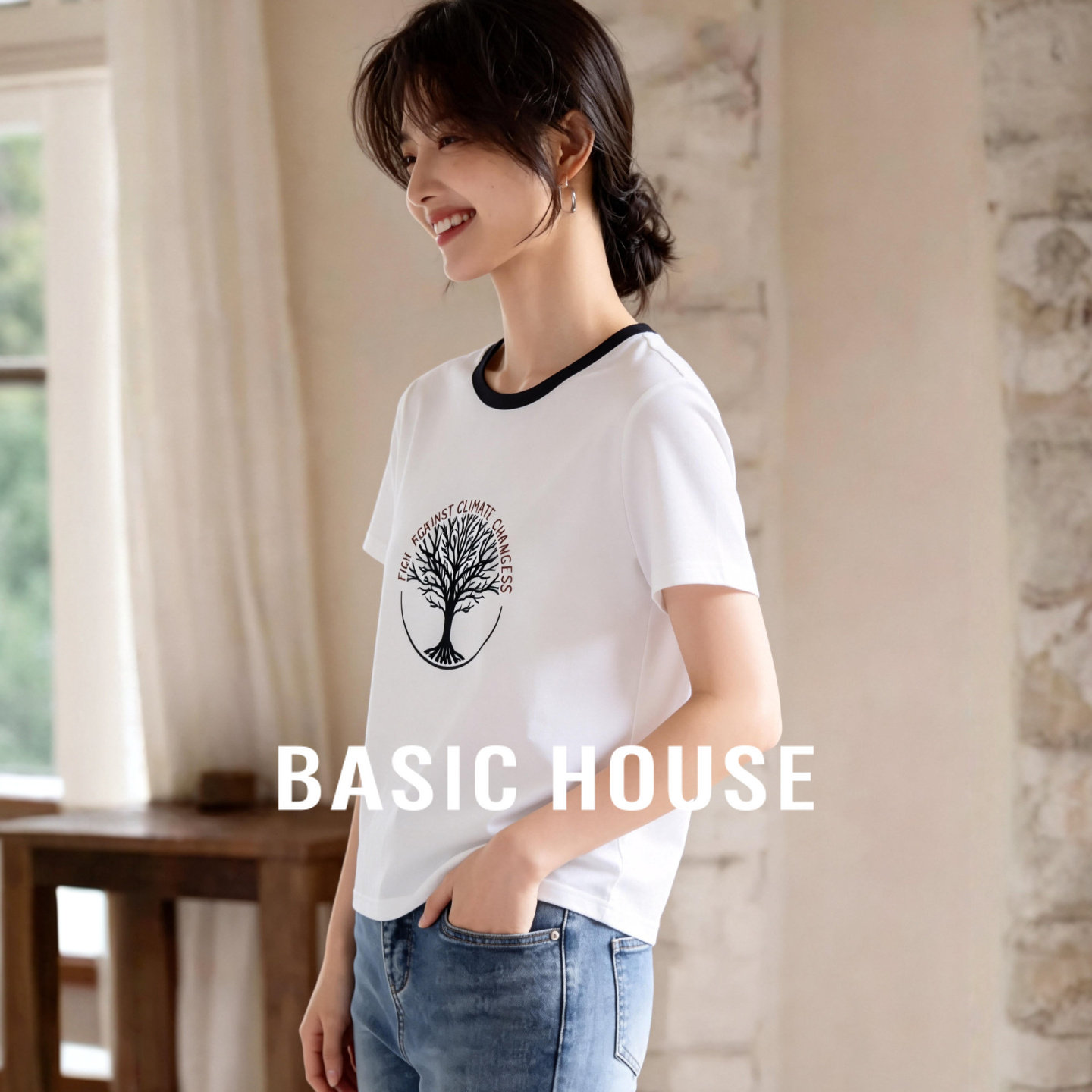 Basic House/百家好白色印花短袖T恤女夏撞色减龄小个子显瘦上衣