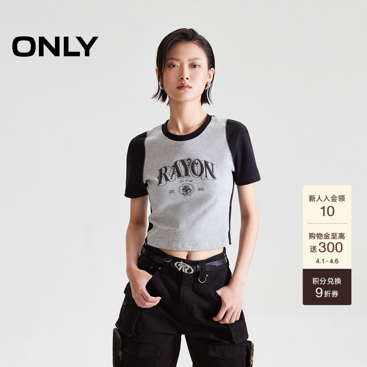 ONLY2025夏季新款撞色拼接立体字母修身圆领短袖短款内搭T恤女