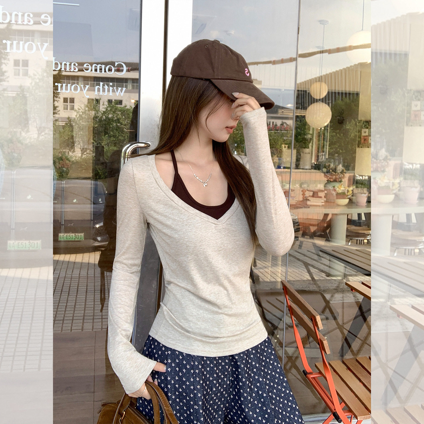 燕麦色辣妹修身V领长袖打底衫女2026春秋带胸垫挂脖系带背心上衣