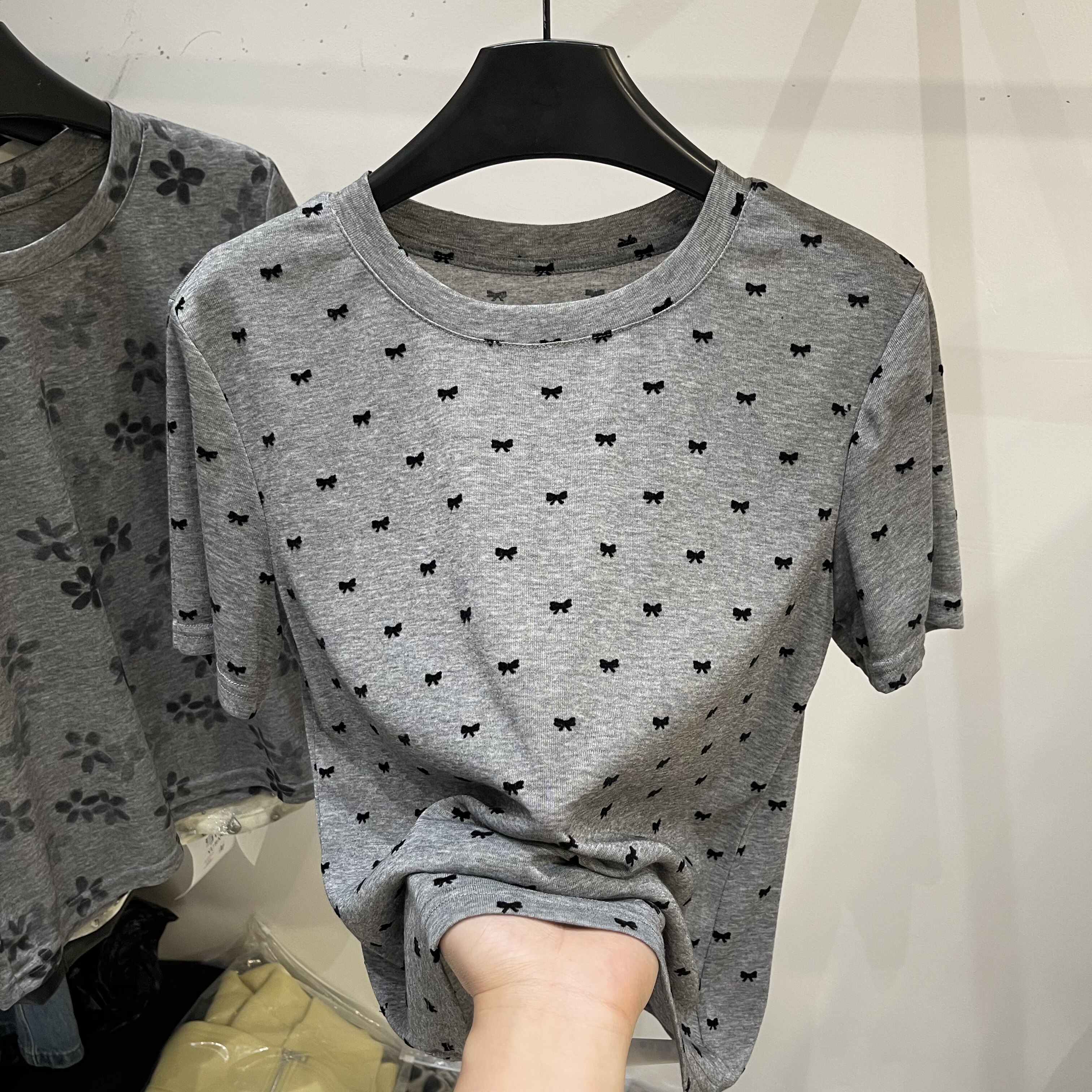 植绒蝴蝶结印花短袖T恤女2026夏季新款灰色圆领宽松显瘦百搭上衣