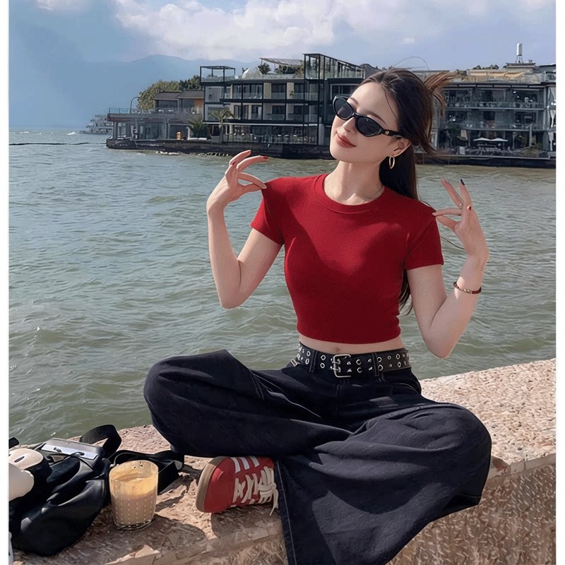红色短款高腰辣妹短袖t恤女夏2026新款简约净版纯色正肩修身上衣