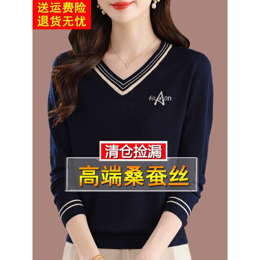 春季长袖桑蚕丝t恤女上衣2026年新款妈妈洋气宽松遮肚v领针织小衫