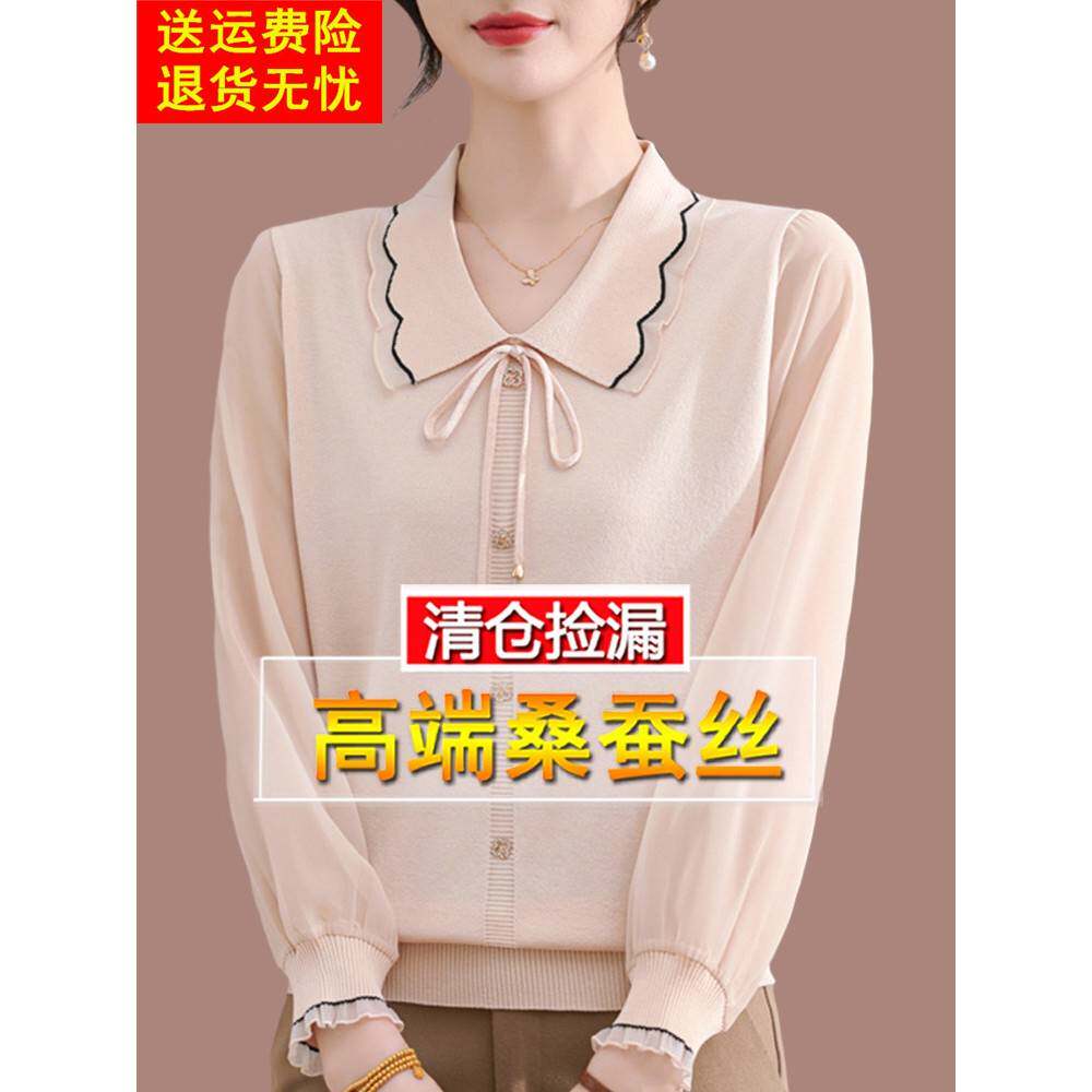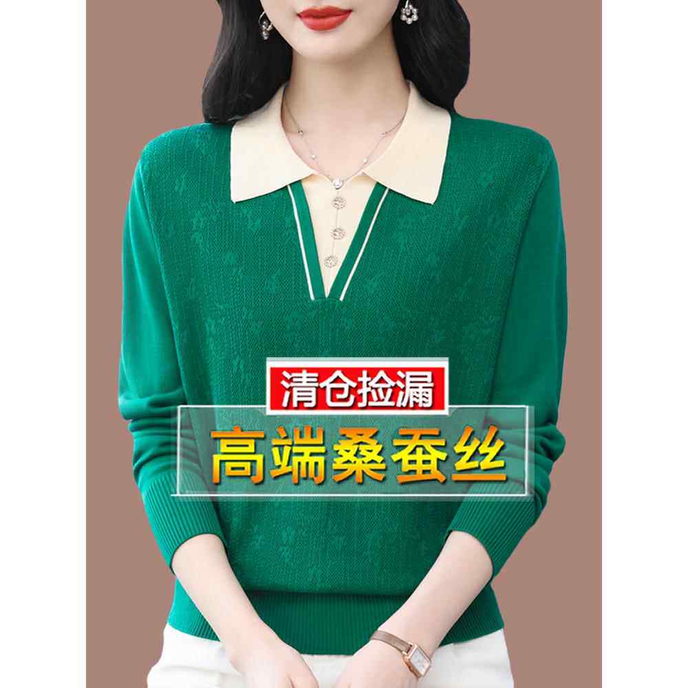2024早秋新款桑蚕丝长袖T恤女polo领打底针织妈妈上衣洋派小衫薄