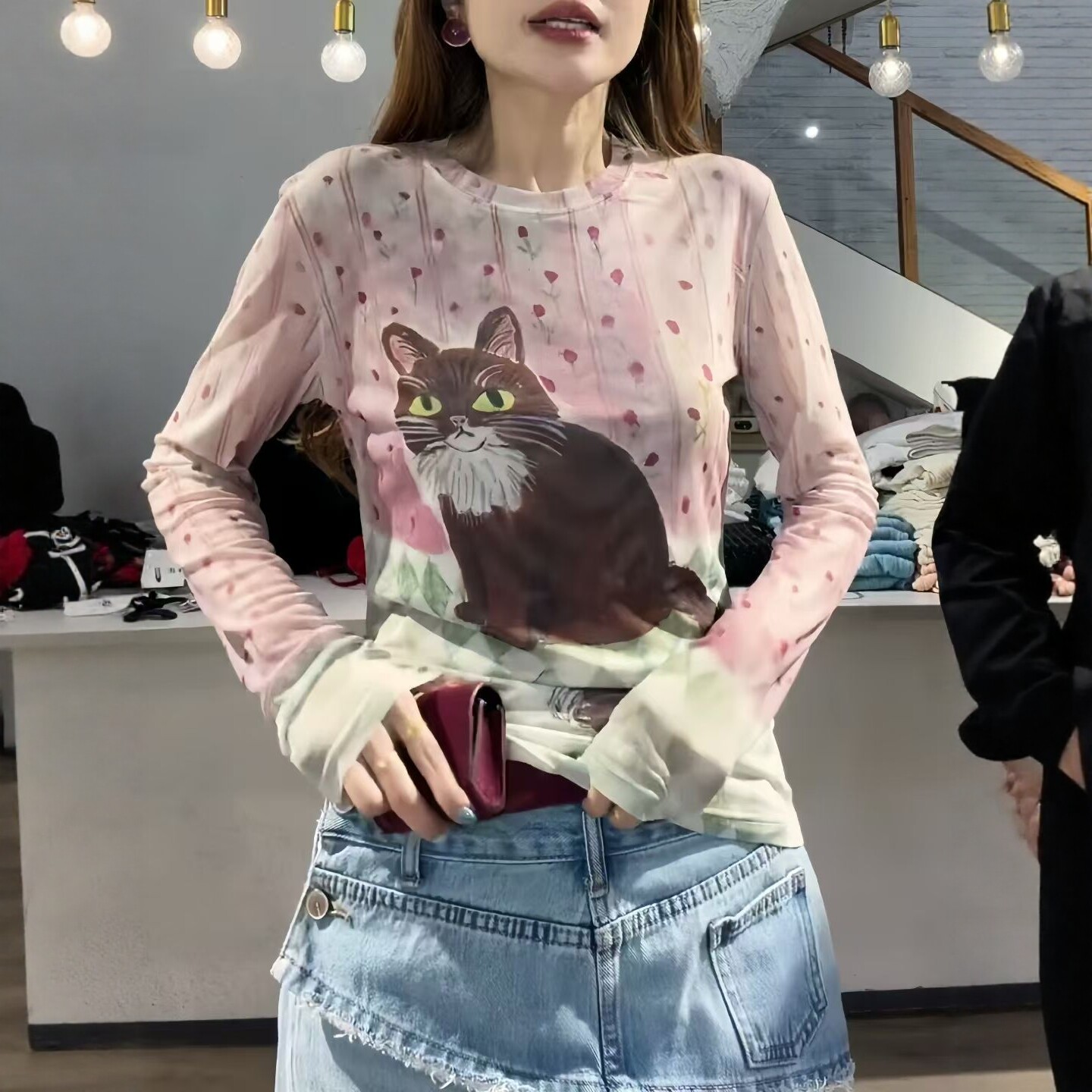 欧洲站 美式复古印花上衣2026春季新款女打底衫薄款网纱T恤防晒衫
