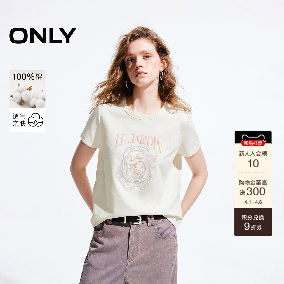 【热销爆款】ONLY2026春季新款纯棉上衣玫瑰印花正肩短袖T恤女