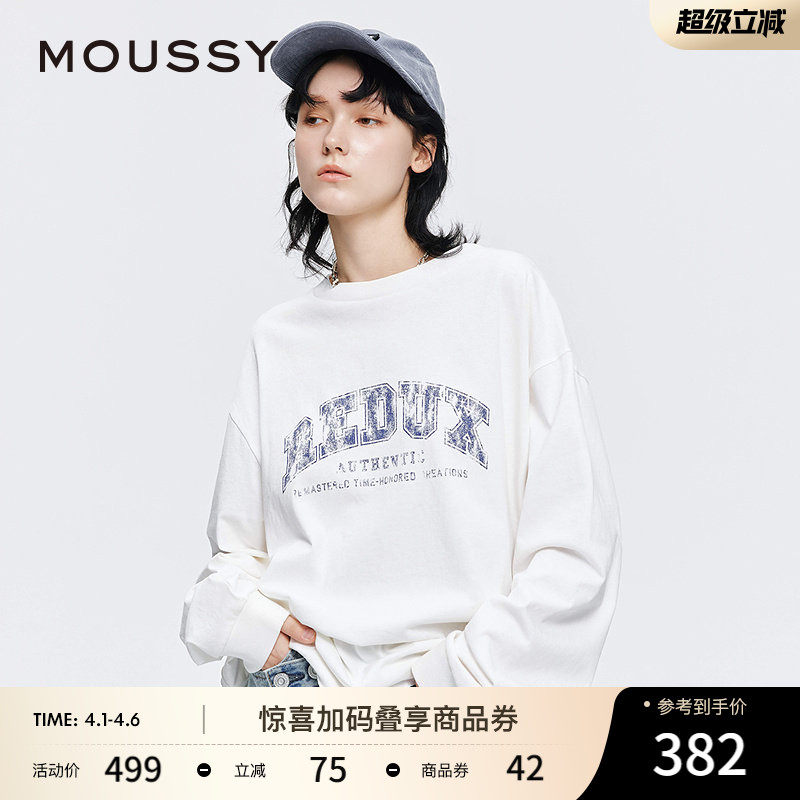 MOUSSY早春新品美式学院风做旧印花长袖T恤女028JSX90-1052