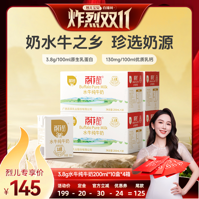 【 先加购!7号炸烈0元付定】百菲酪3.8g水牛纯牛奶200ml*10盒*4箱