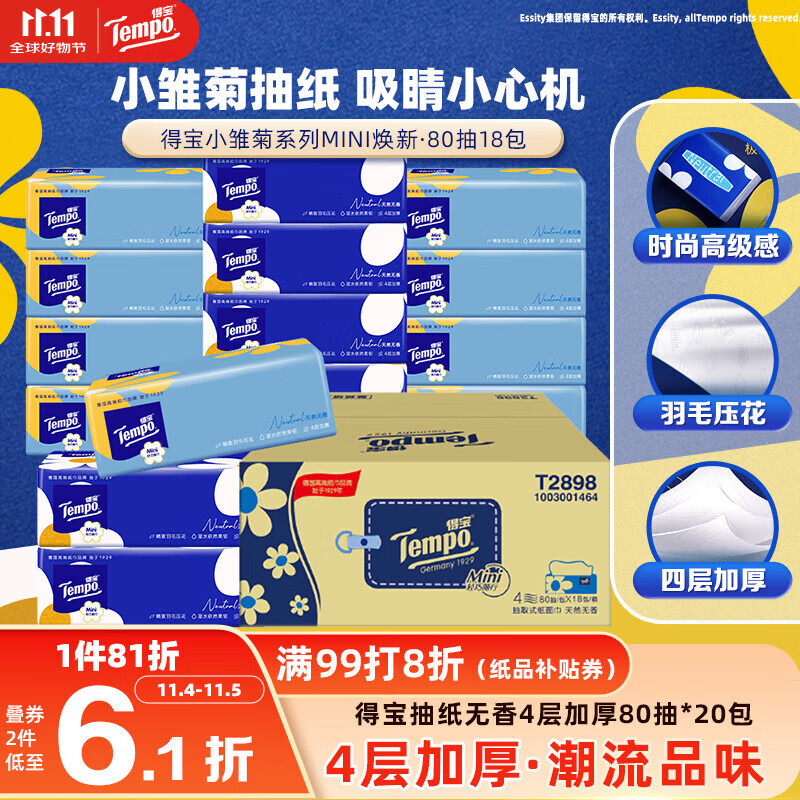 得宝(TEMPO)一博同款 抽纸 小雏菊系列80抽*18包 4层 湿水不易破 纸巾S码