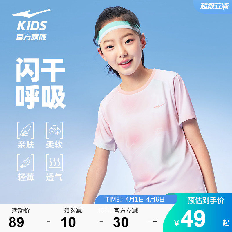 鸿星尔克童装女童短袖T恤运动上衣夏季薄款透气青少年儿童速干衣